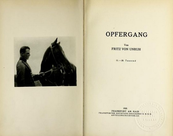 Zur Ehrenrettung des Kronprinzen sei erklärt, daß er an dieser Versetzung keinen Anteil hatte und drei Tage später, als er davon erfahren hatte, den Kadettenfreund von Unruh in die Etappe versetzt hat. Das Werk „Opfergang" wurde indiziert, aber im Dezember 1918 erstmal veröffentlicht. Es ist bezeigt, daß in deutschen Gräben um 1917 aber schon Abschriften zirkulierten.