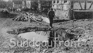 Einschlagtrichter einer Granate neben dem Rathaus am 17. 01.1915. Die Explosion hat die Fenster zerstört.