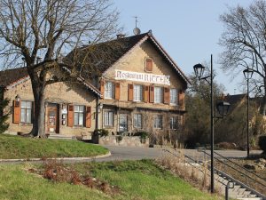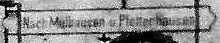Beim Wartehäuschen rechts im Bild das Schild mir der Aufschrift: "Nach Mülhausen und Pfetterhausen".