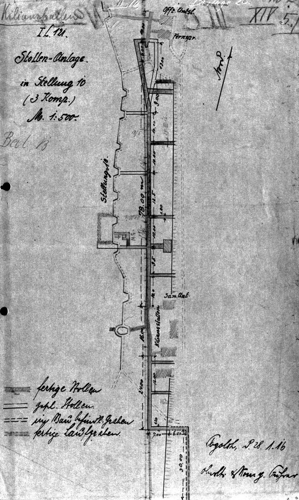 Zu diesen Anlagen befinden sich im Archiv in Stuttgart detaillierte Pläne mit Maßangaben sowie Aufzeichnungen über die Arbeiten an den Stollen. Durch diese Unterlagen konnte ich den Namen "Kilianstollen" belegen und den Archäologen auch durch Bau- und Arbeitspläne weitere wichtige Details liefern. Schon im Januar 1915 konnten in diesem Stollen bis zu 250 Mann untergebracht werden. Im April 1916 war die Anlage schon so weit fortgeschritten, dass Platz für 550 Mann war. Plätze für weitere 100 Mann waren im Bau.