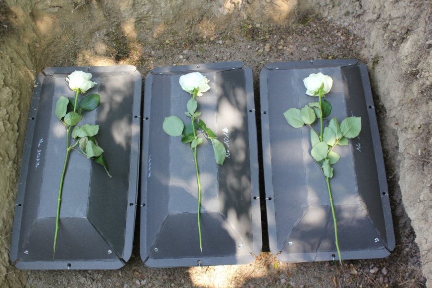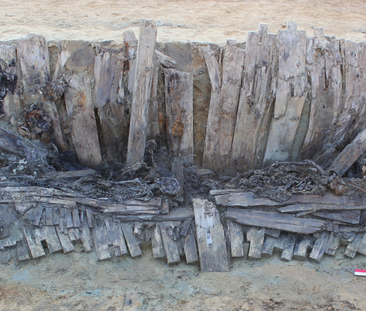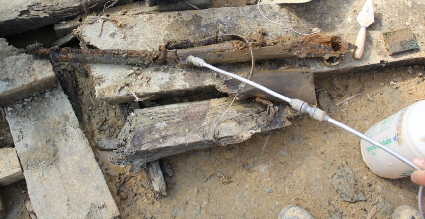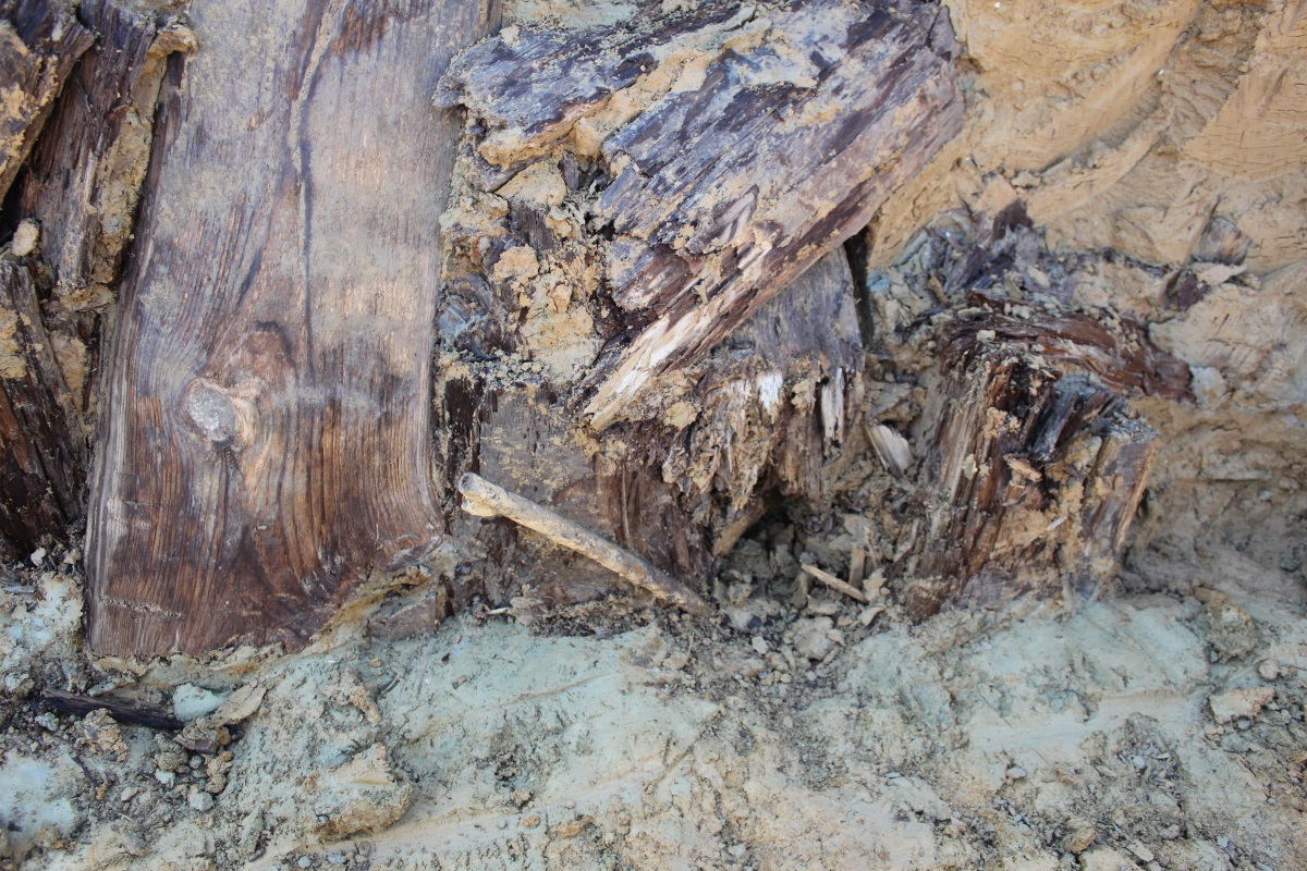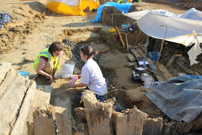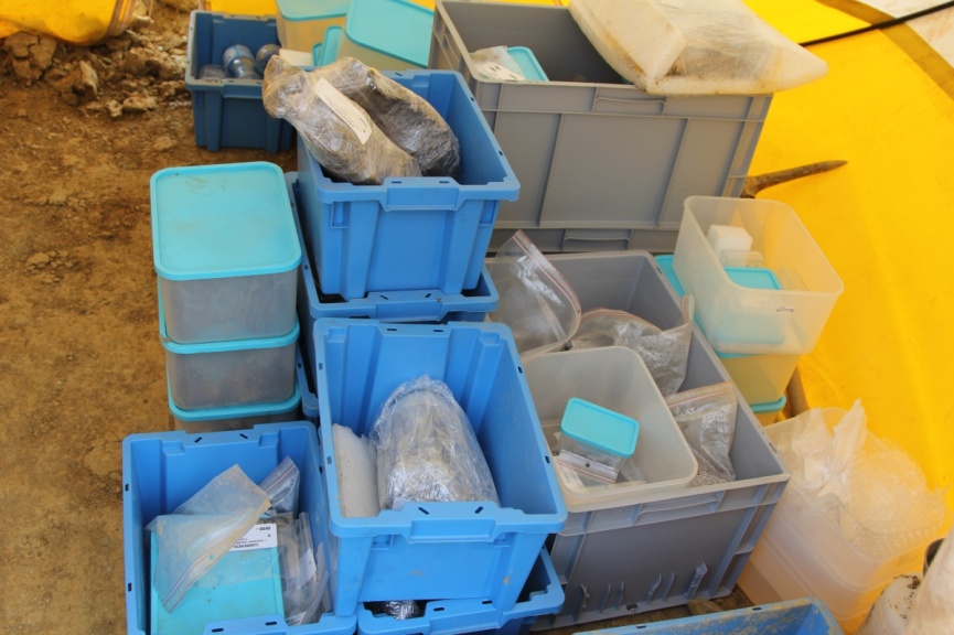 Die Grabungsstelle musste gegen Sonneneinstrahlung geschützt werden, um ein Austrocknen zu verhindern. Deshalb wurden auch die sensiblen Fundobjekte zunächst befeuchtet bevor sie in Folie verpackt wurden.