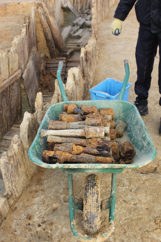 Bei den ersten Arbeiten an der neuen Straße kam zunächst eine Unmenge Kriegsmaterial zum Vorschein. Es waren acht Monate notwendig, um die alte Munition zu finden, auszugraben und zu entsorgen. Alleine diese Arbeiten verursachten Kosten von über 1 Million Euros. Dabei wurden mehr als 12'000 Objekte gefunden, u.a. 1194 Stück Munition (4 Tonnen), davon 619 Blindgänger (noch aktiv). Das Metall musste gesammelt und speziell entsorgt werden. Sprengstoffexperten waren täglich vor Ort, für die Bauarbeiter war die Arbeit nicht ungefährlich.