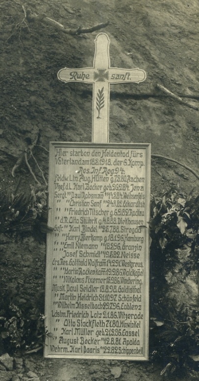 Eine Gedenktafel aus Holz wurde schon 1918 vor einem der Eingänge des Stollens aufgestellt. Sie beinhaltet Namen, Dienstgrad, Geburtsdatum und Geburtsort der Gefallenen.