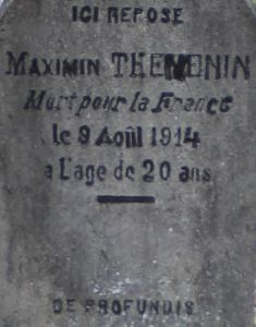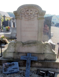 Text auf dem Grabstein: Hier ruhen vier deutsche und zwei französische Krieger. Ehre ihrem Andenken.