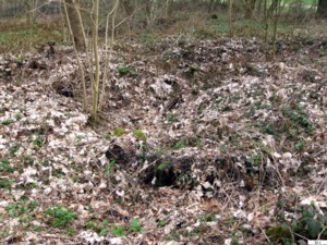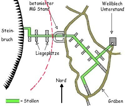 Mehrere Begehungen am Westrand des Illberges führten schließlich zum Erfolg. Der Stollen mit den Liegeplätze westlich des MG-Stands ist heute nicht mehr vorhanden, da der Steinbruch inzwischen bis zum MG-Stand heran reicht (rote Linie), d.h. um rund 10 Meter nach Ost vergrössert wurde.