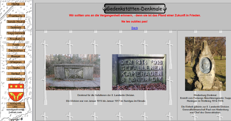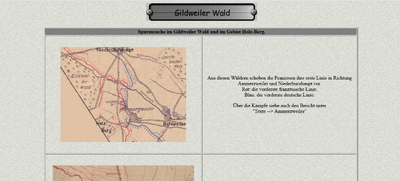 22.6. Update: Texte-->Pégoud = 2 Bilder; 15.6. Inschriften: Panzerwerk Haeseler; 14.6. Inschriften = 6. Ldw. Pi. Ko. 13; 12.6. Frontkarte = Gildweiler Wald - Bois de Gildwiller; 11.6. Frontkarte = Ammerzweiler; 10.6. Denkmale = Kehl - Pi.Batl. 14; 6.6. Frontkarte erneuert; 2.6. Texte = Die Ereignisse in und um Ammerzweiler;