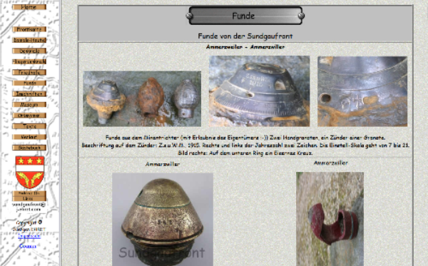 30.5. Funde = Ammerzweiler; 29.5. Damals-Heute = Bernweiler, Lazarett in der Kirche; 27.5. Texte = Der Minentrichter in Ammerzweiler; 13.5. Update: Frontkarte = Aspach-->Kilianstollen; 12.5. Funde = Altkirch;11.5. Damals-Heute = Ammerzwiller; 10.5. Funde = Schönholz (Heidwiller); 9.5. Funde = Ammerzwiller Kopf einer Granate; 8.5. Denkmale = Flagge Unterstand Isteiner Klotz; 2.5. Update Frontkarte --> Schönholz = Straßenbauarbeiten; 1.5. Damals-Heute= Niederburnhaupt Wendelin Kapelle;