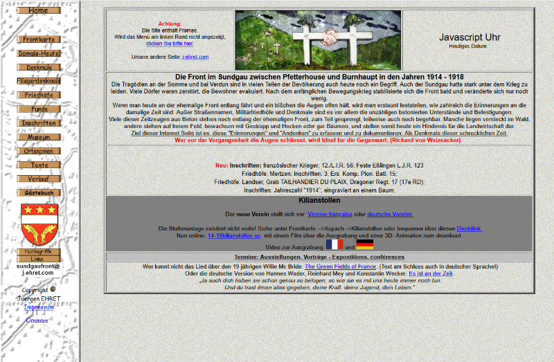 Im Jahre 2008 entsand auf Alleininitiative von Jürgen die Homepage "Die Front im Sundgau im ersten Weltkrieg", die stetig wachsend ein ungeheures Deteilwissen über Bunkeranlagen und Geschichte darstellte und bis 2016 aktiv gepflegt und erweitert wurde. Sowohl durch lokae Erkundung, Überflug mit dem Gleitschirm und dem Vergraben in den Archiven wurde jedes noch so kleine Detail zu Tage gefördert, wenn auch bestimmt heute noch tausende von historischen Puzzlesteinen in der Erde des Sundgaus ruhen.