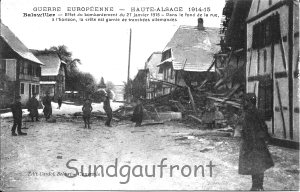 Einschlagtrichter einer Granate neben dem Rathaus am 17. 01.1915. Die Explosion hat die Fenster zerstört.
