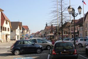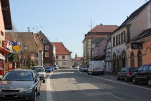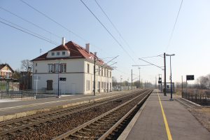 Beim Wartehäuschen rechts im Bild das Schild mir der Aufschrift: "Nach Mülhausen und Pfetterhausen".