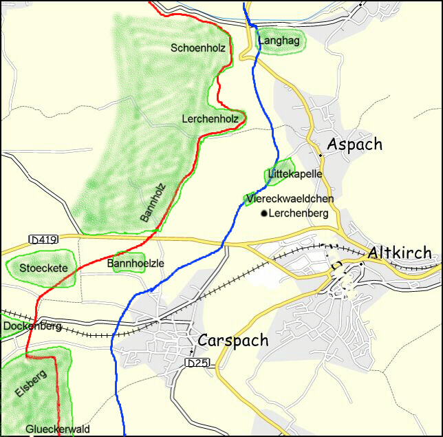 Viel besser war der Feind daran. Seine Hauptstellung gegenüber dem rechten Flügel des L.I.R. 123 lag in dem langgestreckten Waldgebiet von Diefmatten und Gildweiler, das auf einem die Umgegend beherrschenden Bergesrücken das Sulzbachtal vom Spechbachtal trennt. Seine Vorposten hatte er bis an die breite Chaussee, die aus dem Largtal von Balschweiler nach Nieder- und Oberburnhaupt führt, vorgeschoben. Balschweiler bildete einen starken Eckpunkt seines Stellungssystems. Von da folgte seine vorderste Linie dem breiten Taleinschnitt der Larg bis 1,5 km westlich Heidweiler. Das stark bewaldete Höhenmassiv südlich der Larg, östlich der Ortschaften Eglingen, Hagenbach und Ballersdorf, gab den Franzosen gegenüber dem linken Flügel des L.I.R. 123 einen starken, natürlichen Schutz. Vor allem hier fanden ihre leichten und schweren Batterien überall günstige Stellungen. Hierher konnten sie auch mit der über Dammerkirch führenden Vollbahn spielend ihre Truppen und den ganzen Nachschub an Munition, Geräte, Verpflegung aus ihrem Bollwerk „Belfort“ befördern.