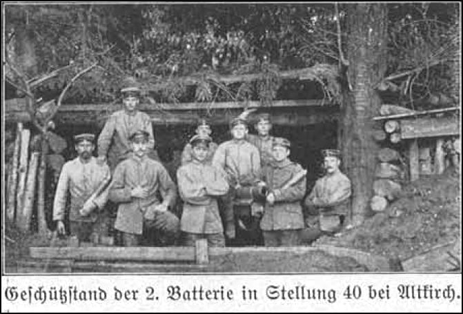 Am kräftigsten schnitten die neuen Weisungen dem 3. Bat., der Reserve ins Fleisch, den hinter der Front musste noch viel mehr geschehen. Die Ortskommandanten hatten ihre Dörfer von heute auf morgen zur Unterbringung von ungezählten Mannschaften und vielen hundert Pferden zurechtzuzimmern. Die Artillerie hatte im Gelände westlich Tagolsheim-Wittersdorf neue Batteriestellungen mit gedeckten Mannschaftsräumen und schusssicheren Munitionslagern zu bauen. Der Auftraggeber hatte anfänglich 200 Mann pro Kompanie und 8 Stunden Tagesarbeit gefordert, dazu 2-3 Stunden für An- und Rückmarsch in strömendem Regen, den es goss unablässig. Da dies nicht durchzuhalten war vereinbarte man Akkordarbeit und damit war beiden Teilen geholfen. Die beiden übrigen Tage war zu exerzieren, zu üben, schulmäßig zu schießen, zu turnen, zu unterrichten, Gasschutz zu proben, Waffenrevision und Appell zu halten, während die Tambours und Hornisten in abgelegenen Wäldchen ihre Instrumente vornahmen. So sah die „Ruhe“ in der Ortsunterkunft für das Reservebataillon aus.