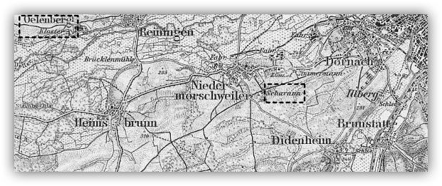 Die 112er hatte man noch rechtzeitig zurückrufen können, unsere 4./142 nicht mehr. Unvergesslich werden uns allen diese Stunden bleiben. Es war eine milde Nacht, ein leichter Nebel lag über den feuchten Wiesen, irgendwo in der Ferne rauschte ein Fluss, oder waren es Kolonnen, die auf der großen Straße bei Schweighausen (Anm.: heute Schweighouse) zogen? Längst hatten wir den befohlenen Platz erreicht, aber von den Brigadekameraden war nichts zu finden. Dagegen stellten Patrouillen fest, daß die nahe Hartmühle (Anm.: heute Ferme de la Hardt) vom Feinde besetzt war: kein Zweifel, wir standen bereits im Rücken der Franzosen! Etwa um 1 Uhr nachts faste unser Hauptmann den Entschluss, der ihm sicherlich schwer wurde, zurückzugehen, die eigenen Truppen noch zu erreichen, falls es noch möglich sei. Wir fanden Niedermorschweiler (Anm.: heute Morschwiller le Bas) noch frei vom Feind, in Dornach stand ein Feuerwehrmann im Schilderhaus, Mülhausen selbst war wie ausgestorben. Hier trafen wir die letzte Jägerpatrouille. Wohl drohte mancher vor Übermüdung zusammen zu brechen, aber jetzt schlapp machen, hieß, dem Feind in die Hände fallen. Da bissen sie die Zähne zusammen und marschierten. Um 8 Uhr vormittags kamen wir nach Neuenburg: über 60 km hatten wir zurückgelegt!