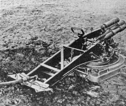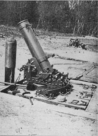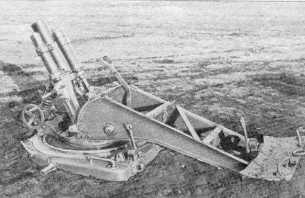 Leichter Minenwerfer mit Lafette in Flachbahnfeuerstellung