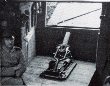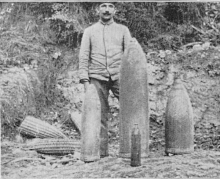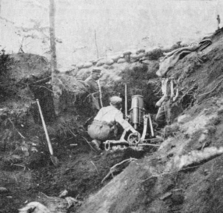 Gegen Abend stieβ der Werfer seine erste Bombe aus. Sie purzelte wie eine Zigarre durch die Luft, fiel in ein Waldstück, lag eine Sekunde lang da, als wollte sie sich besinnen ob sie losgehen sollte - dann geschah ein Krach, wie man ihn noch nicht vernommen hatte. Der deutsche Graben, etwa 70 Meter von der Einschlagstelle entfernt, wackelte. Die Deckbalken, die Stahlblenden lockerten sich und ein schmerzhafter Druck lag dem, der sich dort aufhielt, in den betäubten Ohren."