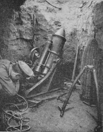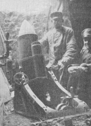 "Am 21. Juni 1915 wurde ein schwerer Minenwerfer eingebaut. Das Ungeheuer sperrte seinen Schlund auf, so weit wie ein Wurstkessel und saβ in seinem tiefen Loche wie ein sprungbereiter Frosch. Die Minen reichten stehend einem Mann bis an die Brust. Der Feldwebel, der das gefährliche Ding betreute, hatte in seinem stämmigen Wuchs eine gewisse Ähnlichkeit mit ihm.