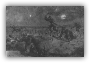 Jetzt bewährte sich das Aufstellen von Posten an den Gassen im eigenen Hindernis. Es wäre für uns bei der stockfinsteren Nacht unmöglich gewesen, dieselben mit der gebotenen Schnelligkeit zu finden. Als der letzte Mann wohlbehalten im eigenen Graben stand, setzte heftiges feindliches Maschinengewehr- und Artillerie-Sperrfeuer ein. Nun sofort Meldung an das Regiment.