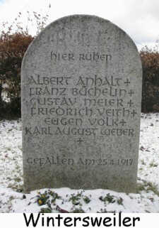 Wintersweiler: Grabstein für die sechs Soldaten der 3. Sturm-Kompanie welche am 25.4.1917 bei einem Sprengstoffunglück ums Leben kamen.