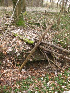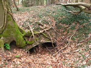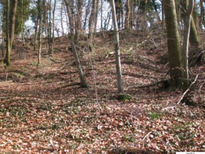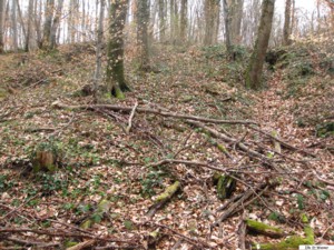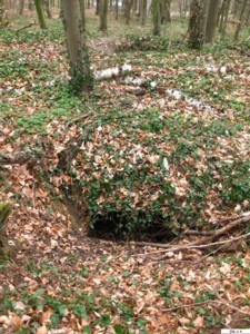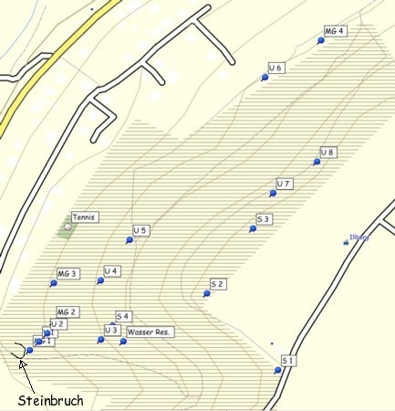 Mehrere Begehungen am Westrand des Illberges führten schließlich zum Erfolg. Der Stollen mit den Liegeplätze westlich des MG-Stands ist heute nicht mehr vorhanden, da der Steinbruch inzwischen bis zum MG-Stand heran reicht (rote Linie), d.h. um rund 10 Meter nach Ost vergrössert wurde.