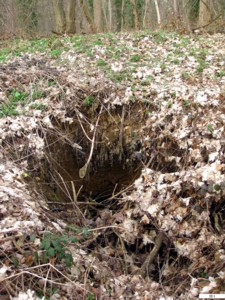 Der Tennisplatz wird nicht mehr benutzt. Ein großes Loch deutet auf einen Stollen-Einsturz hin.