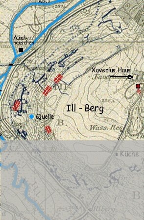 Frontkarte: rot eingezeichnet fünf Stollenanlagen. In den Stollen südlich Xaverius-Haus befand sich ein Sanitäts-Unterstand. Bei "Xaverius Haus" steht heute das "Collège Lucien Herr". Bei der Quelle befindet sich heute das Wasser-Reservoir von Carspach.