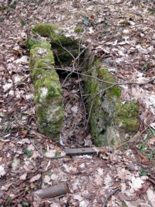Im hinteren Teil der kleinen Schlucht befindet sich noch dieser betonierte Trog. Davor ist noch ein Stück Rohr zu erkennen. Offensichtlich ein Teil der Wasserversorgung.