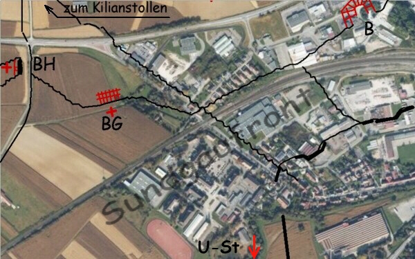 B = "Bader-Stollen", BH = "Bader-Hütte" mit Sanitäts-Unterstand, U-St. = betonierter Unterstand an der Ill.
