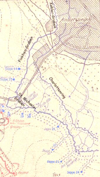 Unzählige Gräben, zum Teil gedeckt, durchzogen das Kampfgelände. Sie verliefen bis in das Spechbacher Holz und Kaufholz, wo Artillerie-Geschütze standen, und nach Bernweiler sowie Oberspechbach. Gräben und Unterstände waren mit Namen versehen, damit man sich in diesem Gewirr orientieren konnte. Einige dieser Namen wollen wir hier vermerken:
