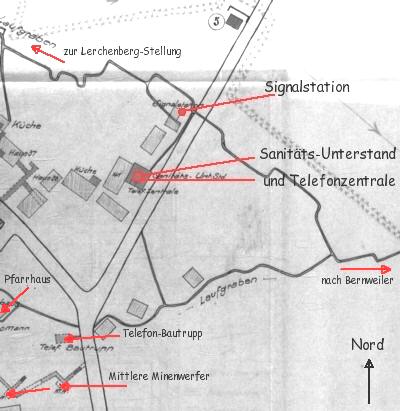 Eingezeichnet sind die Laufgräben und Unterstände mit den entsprechenden Namen. Auch sind zwei Minenwerfer-Stellungen, ein MG-Unterstand, der Bataillons-Unterstand sowie mehrere Munitions-Räume (an der Straße nach Bernweiler) eingezeichnet. Die Keller der Bauernhäuser wurden als Unterstände benutzt und erhielten einen Namen. Der Gewölbekeller des Pfarrhauses war mit 100 Mann belegbar. Überliefert sind die Namen: Stahlmantel, Weissenburg, Falkenstein, Sumpfwache, Ulmer Hütte, Hölle, Räuberhöhle, Mackensen, Fausersheim, Haus Braunschweig, Kuhstall, Kanonenwache, Wiesengrund, Unseld, Immergrün.