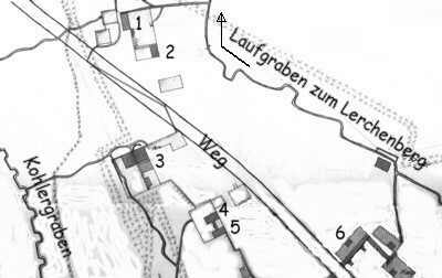 Der Weg ist heute die "rue de la Foret". Der Kohlergraben führte zur Feste Stark, der obere Graben verlief bis zur Lerchenberg-Stellung. Links neben dem Kohlergraben befand sich damals ein Teich. Die Zahlen 1 - 6 bezeichnen Unterstände in Scheunen.