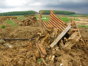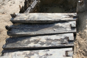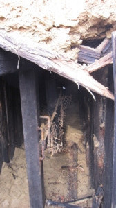 Dort wo die Deckenhölzer fehlen, wurden die Seitenwände eingedrückt.Die Rahmenhölzer und Deckenbalken sind bemerkenswert gut erhalten.