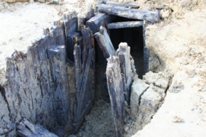 Ein Stolleneingang wurde schon freigelegt. Eine Treppe aus Holz führt hinunter. Im Innern erkennt man das Holzgestell einer Pritsche, welche als Schlafstätte diente.