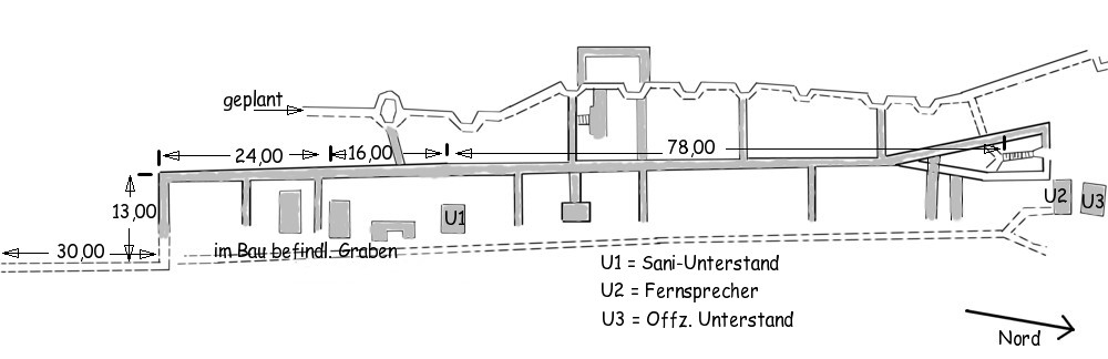 Hier ein Kartenausschnitt eines Stellungsplans von damals mit der Lage des Stollens. Unsere oben angegebenen Koordinaten haben sich somit bestätigt.