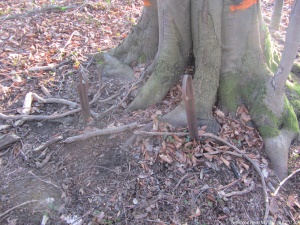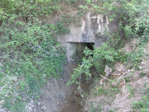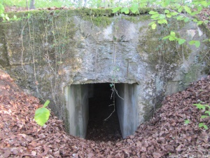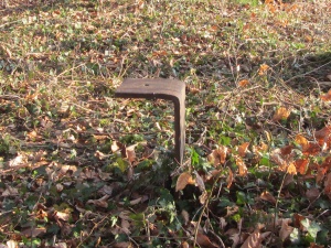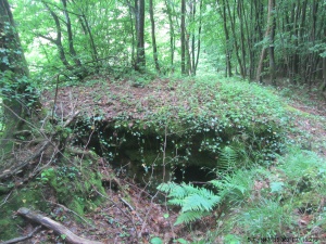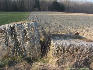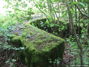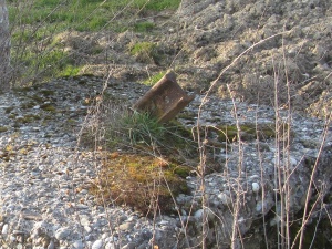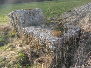 Am Wegrand zwei Betonwürfel die 2012 mit schwerem Gerät ausgegraben wurden. In den Beton sind Eisenbahnschienen eingegossen.