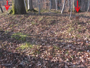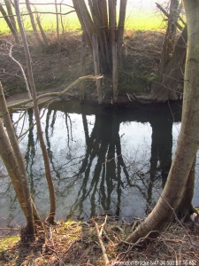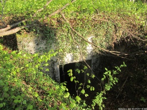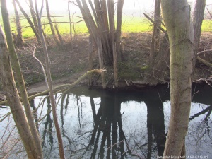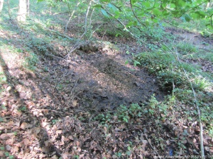Im Hirtenholz, nahe der Feldbahnlinie, ein kaum noch erkennbares Wasserbecken.