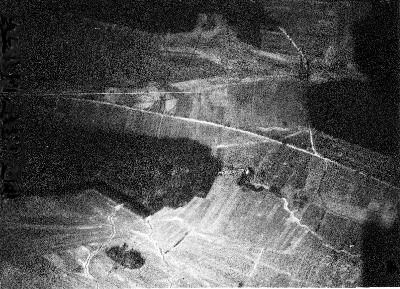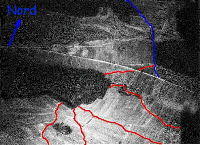 Luftbild vom "Stöckete". Blau eingezeichnet die Straße nach Hagenbach. Rot eingezeichnet die französischen Laufgräben.