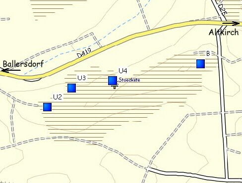 Das Wäldchen "Stöckete" an der Straße Altkirch - Balschweiler. Karten von damals und heute. Im Gelände sind noch diverse Laufgräben, Granattrichter und Mulden von Unterständen sichtbar.