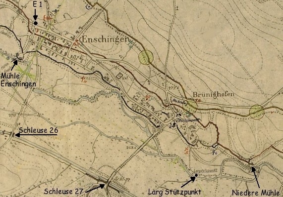 Über die Ereignisse die sich hier abspielten, haben wir in Enschingen – Brünighofen und der Stoßtrupp gegen die Schleuse 27, 9. November 1916 berichtet.