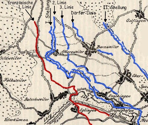 Karte vom Frühjahr 1917 mit den einzelnen Stellungen. Eine Zwischenlinie, zwischen der I. und der II. Stellung, bildete die Dörfer-Linie. Sie umfasste die Dörfer Bernweiler, Ober- und Niederspechbach. Diese Ortschaften waren mit breiten Drahthindernissen gesichert und durch betonierte MG- und Wohn-Unterstände zur Verteidigung eingerichtet. An einer 3. Stellung wurde gebaut. Sie zog von Galfingen in süd-östlicher Richtung. Galfingen wurde dabei durch zahlreiche, sehr stark angelegte Betonkeller verteidigungsfähig gemacht. So wurden in Scheunen und Kellern von Bauernhäuser mit Eisenbeton Maschinengewehr- und Wohn-Unterstände eingebaut.