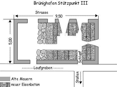 Der Stützpunkt III wurde als Maschinen-Gewehr-Stand ausgebaut. Er lag zwischen der Straße und einem Laufgraben. Die Betondecke war mit vier Lagen Eisenstäben armiert und 1,20 Meter dick. Durch den "Schlupf" gelangte man in einen Stollen, welcher den Mannschaften als Unterstand diente.