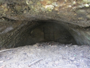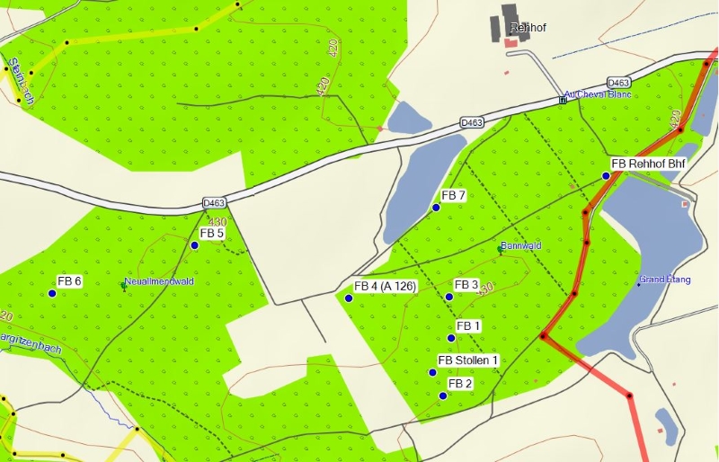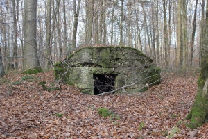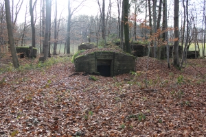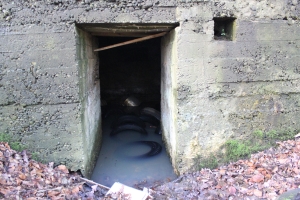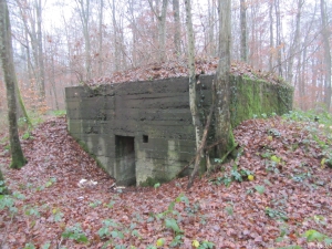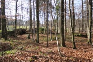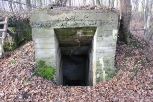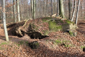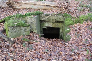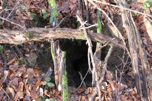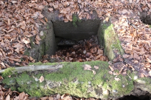 FB 2: Deutliche Gräben und Löcher von Stolleneingängen oder Fuchslöcher vorhanden. Ein betonierter Unterstand dessen Eingang verschüttet ist.