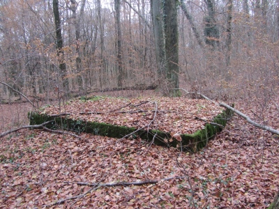 Außer einigen Mulden und Trichter erinnert nur noch dieses Wasserreservoir an das ehemalige Waldlager. An der Innenwand befinden sich Steigeisen um in den Behälter zu gelangen: