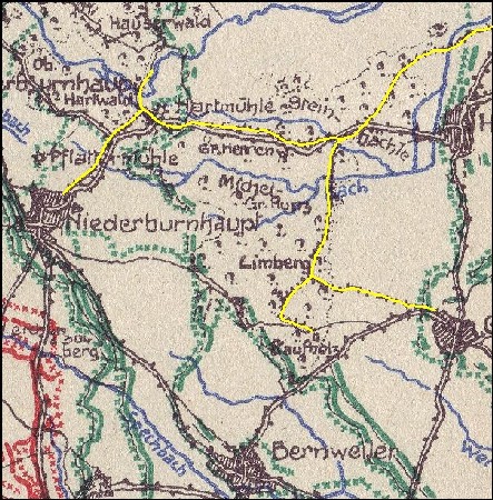 In Gelb eingezeichnet der Verlauf einer Feldbahn, die von Niedermorschweiler kommend nach Niederburnhaupt, dem Kaufholz und nach Galfingen führte.