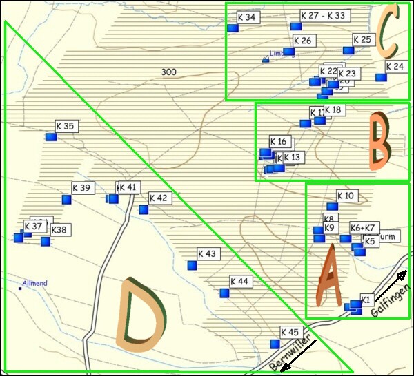 Interaktive Karte: wir haben die Bauwerke mit K 1 bis K 45 bezeichnet und wegen der Übersichtlichkeit in 4 Sektoren (A-D) aufgeteilt. Das K steht für Kaufholz. Eine Begehung nach dieser Nummerierung ist sinnvoll aber nicht zwingend. Bei Problemen mit der Wiedergabe der interaktiven Karte sind folgende Beiträge verlinkt: A (K1 bis K10), B (K11 bis K18), C (K19 bis K34) und D (K35 bis K45).