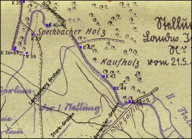 Hier ein Kartenausschnitt von 1916 mit der ungefähren Lage der noch vorhandenen Bauten und den Gräben von damals. Mehrere Laufgräben verliefen Richtung Südwest nach Ammerzweiler und Bernweiler zur 1. Feuerlinie in der vordersten Stellung.
