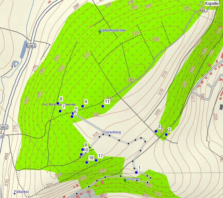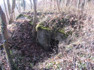 16 (N47 42.441 E7 17.344); Unterstand, 1 Raum, Eingang mit Schikane, Schießscharten am Eingang und in Richtung Hochstatt.