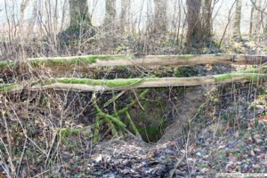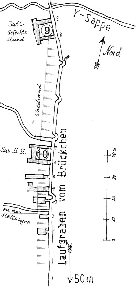 (10) Sanitäts-Unterstand, er befand sich hier in der neuen, dritten Linie. Eingestürzte, verschüttete Stolleneingänge sind auch heute noch im Gelände erkennbar.