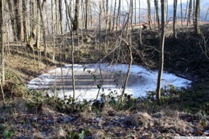 Wo die Y-Sappe auf den neuen Laufgraben trifft, war der (9) Bataillons-Gefechtsstand in einem Stollen untergebracht. Unweit dieses Stollens befindet sich heute dieser große Krater mit einem Durchmesser von etwa 25 - 30 Meter, der in seiner Dimension an den Minentrichter von Ammerzweiler erinnert. Was sich hier genau ereignete, ist nicht bekannt.