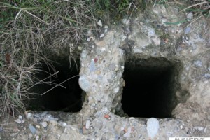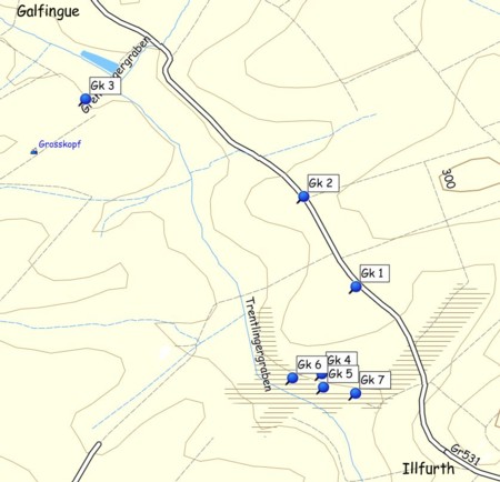Gk 1 (N47 41.077 E7 14.797): Eine leichte, unbewirtschaftete Bodenerhebung am Wegrand. Zwei Öffnungen noch sichtbar.