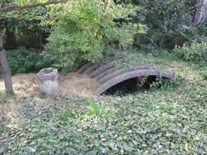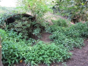 Die Eingänge sind durch Wellblech geschützt. Auf dem Dach zwei betonierte Rohre für Rauchabzug / Lüftung.